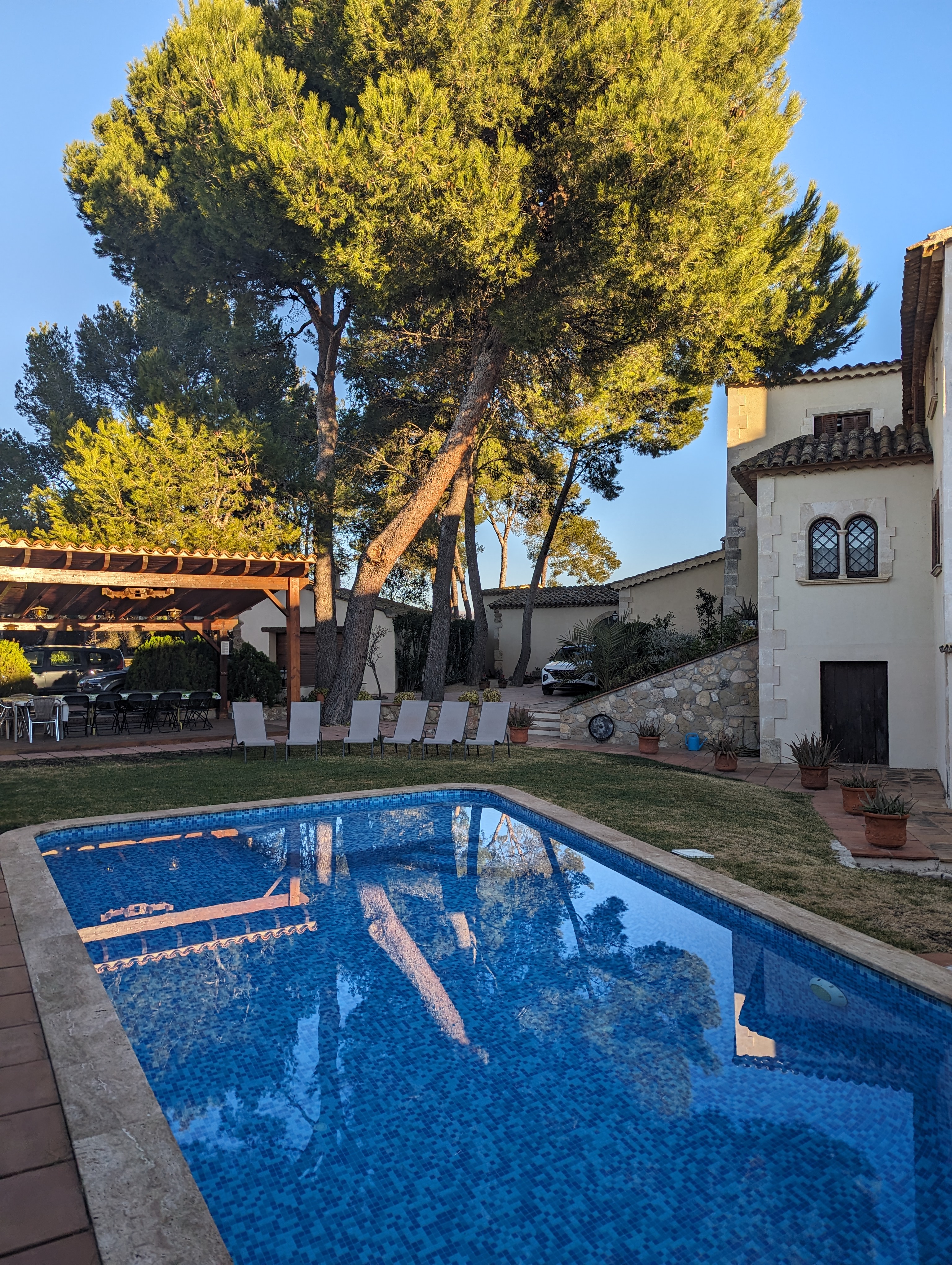 Lo planeado para el viaje a Barcelona requiere un buen madrugón para salir pronto y llegar a la casa justo a la hora de comer; la familia barcelonesa nos ha comentado que ellos piensan ir a media mañana, para poder tener preparado el asunto barbacoa etc. Así que a eso de las 7 y pico... Pasamos a recoger a Tachón por Sani. En principio conduzco yo, pero el chaval se muestra impaciente por coger las riendas del coche. En la primera parada, la de mear en la autopista, el peque se sienta al volante y ya no lo suelta hasta el regreso a Bilbao... jejeje. Comemos un bocata de chorizo en el área de Logroño y continuamos viaje sin otras paradas que las que Alberto Junior dedica a vaciar su nerviosa vejiga. Son las dos y pico cuando llegamos a Puigdàlber, a Can Ferrán, una masía con historia... XVIII XIX XX XXI. La familia nos espera con expectación. La casa es espectacular. La barbacoa, a las órdenes de Francisco, chisporrotea con leña del lugar; paella de marisco y lo que se preste. Los participantes suman 17 personas, contando a los 3 recién llegados desde el Norte. El grupo familiar de los Ros es el más numeroso: Angels y Francisco, los mellizos Judith y Francesc, el mayor Marc, las novias de ambos, Montse y Ariadna; 7 en total. El grupo familiar de los ZUGO: Charo y Chescu, Víctor, Marta y Mikel, Irati y Rubén; 7 en total. Estos suman 14 y con nosotros 3 hacemos 17; pero tras la comida las parejas de los hermanos Ros y Marc marchan a sus casas respectivas y a sus celebraciones familiares; 14 personas pernoctamos en la casa. La paella la disfrutamos en el jardín, junto a la piscina. El tiempo acompaña, hace fresco pero luce un solo precioso, mediterráneo. El resto del día... Un paseo para ir conociendo el pueblo. Recorrer los rincones de la casa. Preparar la cena y cenar. A nosotros nos han reservado una habitación estupenda, con su baño particular, su balconcito en la fachada principal, su cómoda cama de uno cincuenta; muy bien, de verdad. El p... leer más |