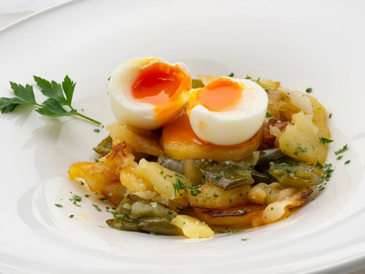 90 Patatas escabechadas con huevos Molletlunes, 19 de diciembre de 2022  Para el escabechado: majar cuatro dientes de ajo, 80 ml de agua, 80 ml de vino blanco, 300 ml de vinagre y sal. Se fríen las patatas en lonchas. Luego se pasan a una cazuela, se añade dos hojas de laurel y 15 gramos de pimienta y ahí se añade el majado. Se deja cocer todo 10 minutos. Además del majado se incorpora un cazo del aceite de freír las patatas. Se sirven las patatas y encima se les pone un huevo mollet, que es un huevo cocido 5 minutos. | #meta - #patata - #huevo - #escabeche