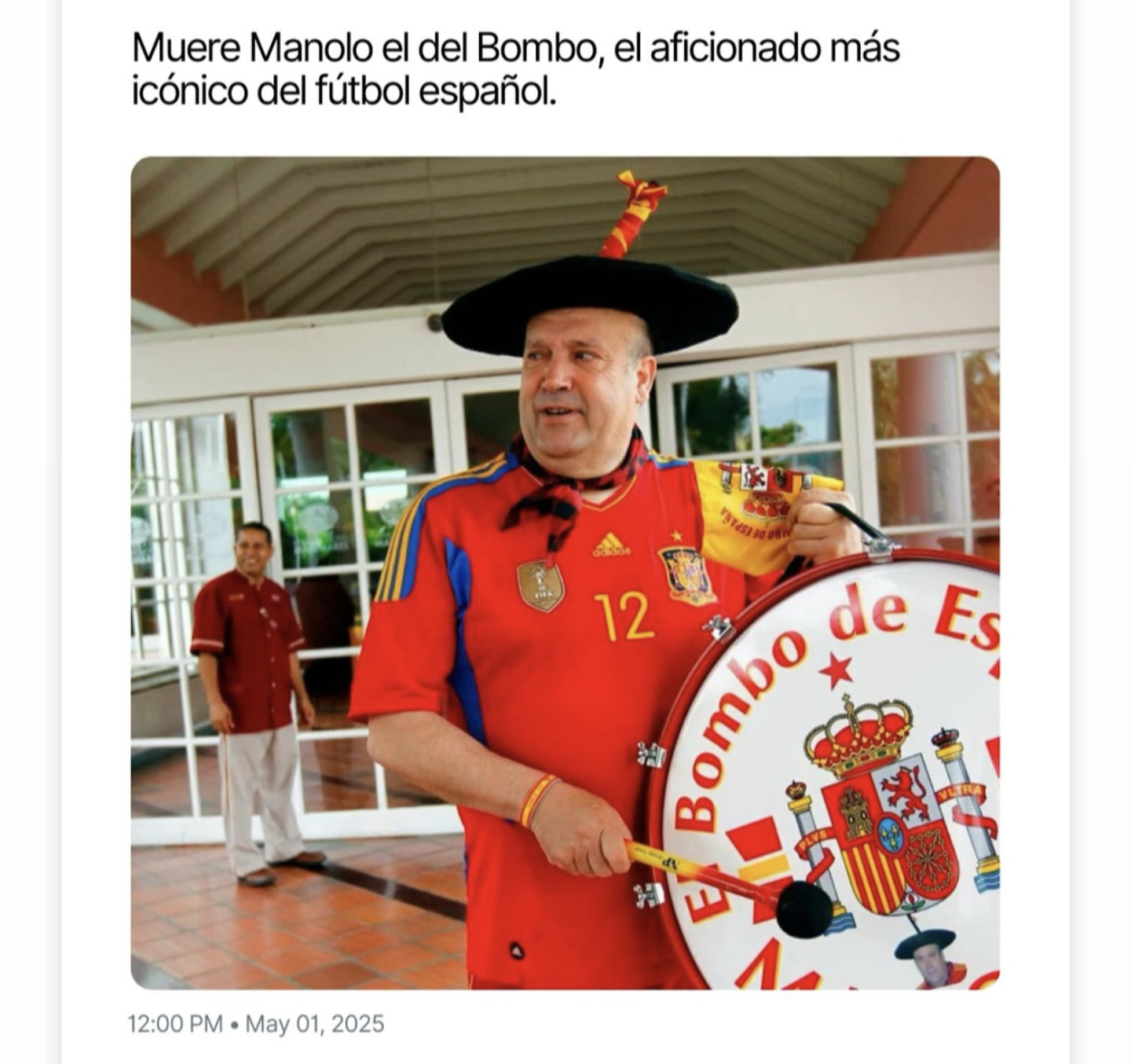 El 1 de mayo de 2025 Manolo fue encontrado sin vida a sus 76 años de edad en su domicilio de Moncófar, en la provincia de Castellón. Su última aparición fue en el Estadio de Mestalla, en el encuentro disputado entre la selección española y Países Bajos por los cuartos de final de la Liga de Naciones de la UEFA 2024-25 a finales de marzo de ese mismo año. Manolo llegó a asistir a 10 mundiales a lo largo de su vida: España '82, México '86, Italia '90, Estados Unidos '94, Francia '98, Corea y Japón 2002, Alemania 2006, Sudáfrica 2010, Brasil 2014 y Rusia 2018. | #muerte - #futbol - #manolo - #bombo