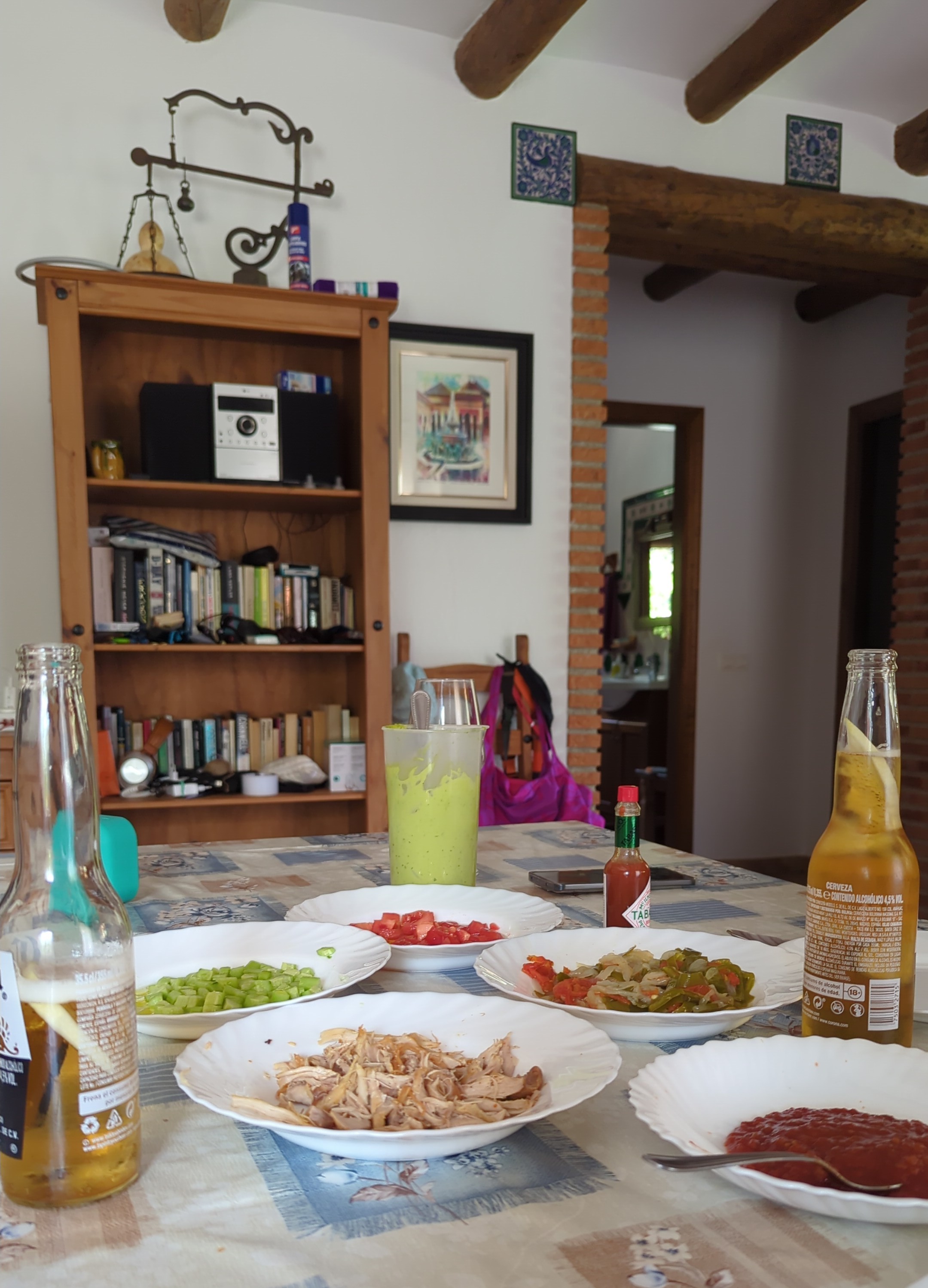 398 Dia 14 - Tacos mejicanos made in nosotrossábado, 08 de junio de 2024  Plan: Tacos mejicanos made in nosotros. Es de obligada acción montar en el coche para ir al Consum a comprar ingredientes para preparar los tacos, ya que carecemos de casi todo lo necesario, al menos sí de lo fundamental, como tortitas de maíz, salsas mejicanas, verduras variadas, etcétera. Por supuesto no nos olvidamos de unas Coronitas, imprescindibles para un festejo con sabor azteca. La jugada sale muy bien; Raquel se encarga de casi todo, yo sólo hago de pinche molesto. Nos quedan muy ricos, buenísimos. La sobremesa se llena de botellines de cerveza, risas y músicas. Por movidas como ésta es por lo que adoro a mi tesoro moreno... :D | #2024orgiva - #consum - #tortitasmejicanas - #fieston