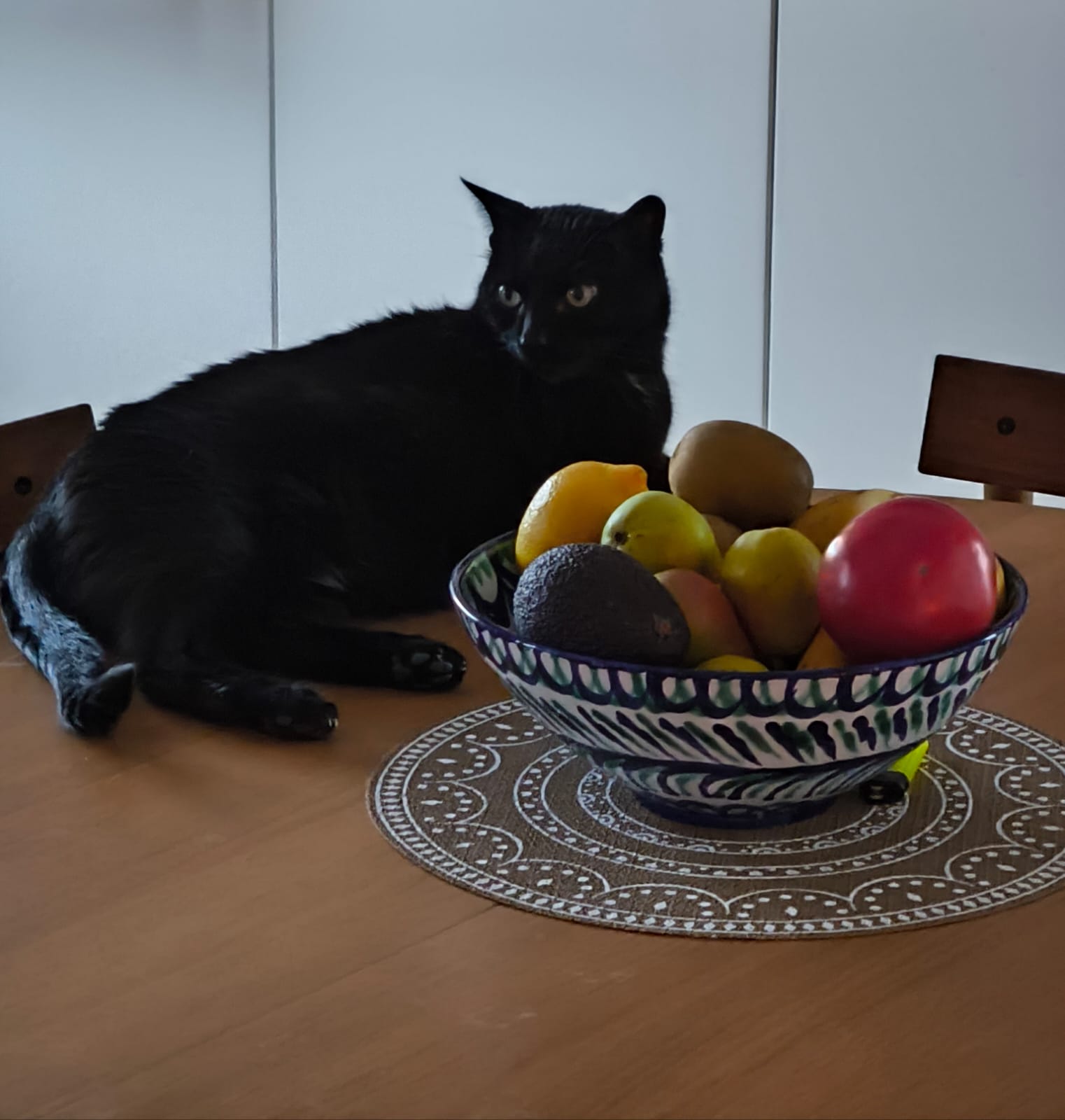 393 Merluza con patatas y Tachónjueves, 11 de julio de 2024  A primera hora, tras las piernas en la terraza bajo la supervisión de Maite, me he acercado al BM a recoger la merluza que dejé encargada ayer; un merluzón de categoría, para preparar un guiso con patatas. Un pase por la frutería a por complementos vegetales para el guiso y a casa. El resto de la mañana me he entregado en cuerpo y alma al cocineo. He arrancado preparando un caldo de calidad, con las espinas y la cabeza, una cebolla y perejil. Una vez colado el caldo, he dejado a remojo media docena de patatas hermosas previamente peladas. Sería algo así como las doce cuando he empezado la preparación del sofrito, en la cazuela enorme negra, lo suyo. Dos cebollas hermosas, un par de dientes de ajo y un buen chorro de aceite; y perejil seco. Cuando el sofrito estaba en su punto he añadido las patatas bien cortadas haciendo crac; remover y verter caldo hasta cubrir; y a esperar. Al chupchup el guiso va cogiendo forma; añadir caldo un par de veces, unos toques de estragón y pimienta negra recién molida; a media cocción incorporo un buen puñado de guisantes finos congelados, del BM, para poner la nota de color. Se comprueban las patatas... perfectas; es el momento de añadir la merluza, una buena cantidad, las dos partes del la cola, con pintaza. Cuando ha llegado el peque, sobre las dos, el guiso estaba listo. He colocado en el centro de la mesa una ensaladera con pepino, rabanitos y cebolleta, que también ha sido del gusto del personal. ¿Y las patatas? Las patatas me han quedado SOBRESALIENTES. Qué felicidad dar bien de comer a mis amores. Al terminar le hemos regalado a Tachón la camiseta que le compramos en Capileira (pendiente foto), que le ha gustado mucho; qué bien. Aún se ha quedado un rato con nosotros, hasta las cuatro y media que había quedado con Sergi; ha confraternizado con Indi (Indi es un cielo, se le ha acercado buscando mimos, es más majo). | #tachon - #alberto - #lavadora - #serie - #mementomori