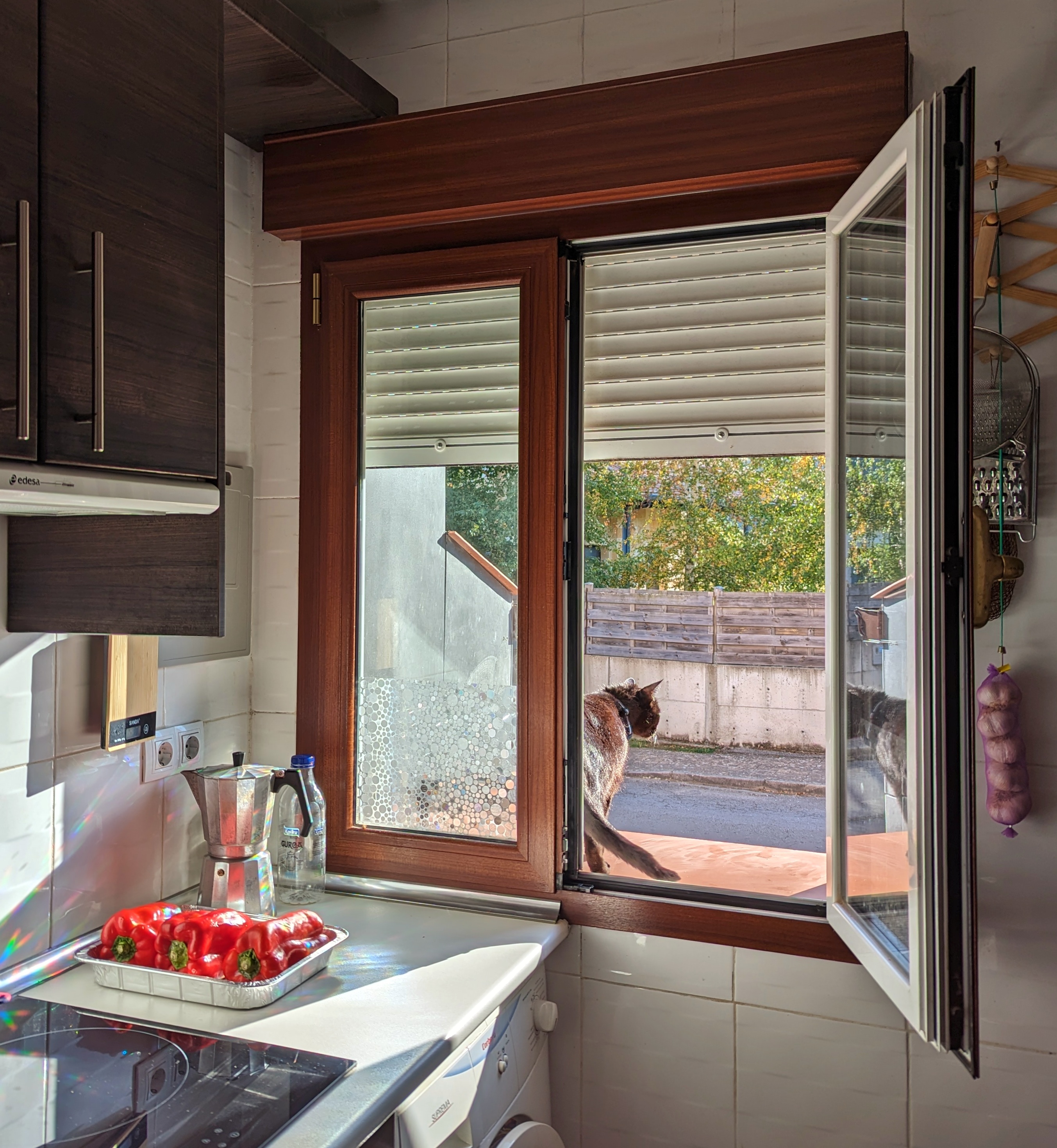 1900 Soncillo, bacalao y la Rebeviernes, 06 de octubre de 2023  Viernes. Raquel está muy metida en sus asuntos de coordinadora, todos los temas están muy candentes y se entrega sin cortapisas a sus multis y a sus mails; mientras yo... Disfruto de una mañana de viernes de las buenas, de las que se disfrutan de verdad. Tras el cafelito y las tostadas con guacamole del Mercadona, me instalo en la cocina del pueblo y me dispongo a preparar unas elaboraciones culinarias de ésas que absorben mucho tiempo y un poco menos de esfuerzo: salsa de tomate y pimientos asados. Con ambas elaboraciones vamos a cubrir los menús del día: bacalao desalado sobre tomate y acompañado de pimientos asados. Un par de horas entre una cosa y otra. La salsa de tomate requiere pochar lentamente bien de cebolla finamente picada; y al cabo de ese mucho rato añadir una lata pequeña de tomate triturado y las especias y condimentos al gusto, en este caso se espolvoreó pimienta negra, azúcar moreno, orégano seco, pimentón dulce y un par de cayenas bien picadas. La cebolla casi la hora pochando. Al tiempo que se hace la cebolla voy calentando el horno a 200º. He untado en aceite tres hermosos pimientos rojos y los he colocado primorosamente sobre una bandeja desechable de aluminio, y al horno. Durante veinte minutos por un lado, y durante unos diez por el otro; me parecía tiempo suficiente ya que iban cogiendo aquí y allá el color de lo quemadillo, pero más tarde, al ponerme con la tarea del pele y comprobar que no salían las pieles con la debida facilidad, me percaté de que hubiera sido más sensato respetar los veinte minutos por cada cara, incluso algo más; de todos modos los pimientos estaban ricos ricos. A todo esto, durante esas horas de cocineo mañanero el Indalecio ha dado mil vueltas de aquí allá, saliendo, entrando, subiendo a la ventana del dormitorio, a la ventana de la cocina, al tejadillo del portal, pidiendo algo de picar, pidiendo mimos y atenciones, con esa carita de felicidad que se le pone cuando está feliz y contento; creo que el chava... leer más | #202310santelices - #soncillo - #bacalao - #rebeca