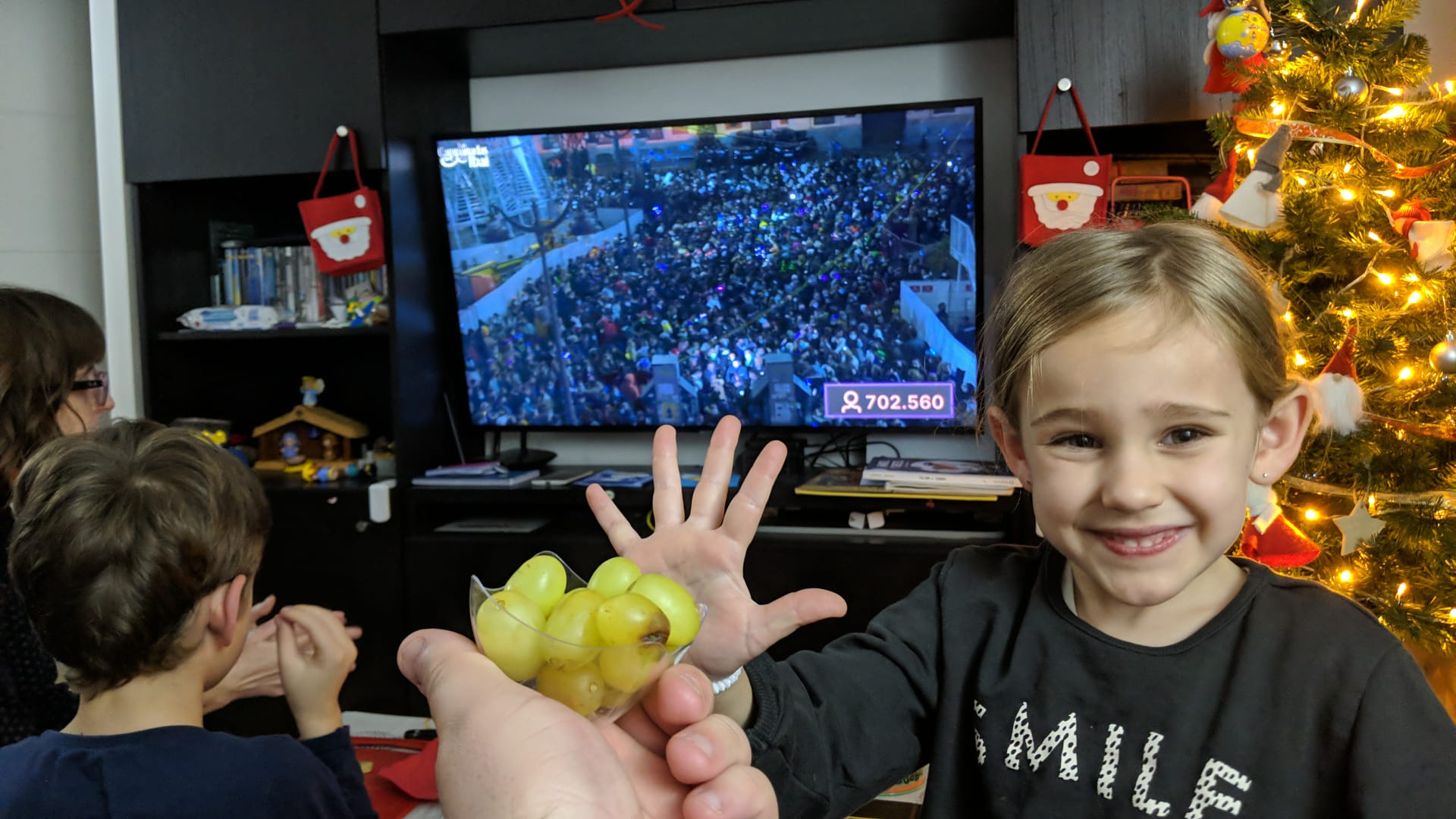 3 Nochevieja en pantalla grandemartes, 31 de diciembre de 2024  Este año la cena de Nochevieja se prepara y se consume en nuestra casa. Entre los asistentes no está tampoco este año mi chiquitín, pues no le convencen las opciones de transporte al término de la cena. En el menú que hemos desplegado sobre la mesa no falta una serie de clásicos familiares, como jamón, tortilla de patatas (mi especialidad), pastel de bonito (otra de mis especialidades), queso, paté, aceitunas y tal y cual. Y tras retirar los pocos restos de los entrantes damos paso a los platos calientes: croquetas y gambas plancha. Y ya, y de sobra. Todo ello regado con vinos blancos de Navarra y cava. Una vez concluida la cena... damos comienzo al espectáculo, un espectáculo... cinematográfico: sorprendemos al personal desplegando la pantalla grande y proyectando sobre ella la luz del proyector, sobre la que cabalgaban las cadenas generalistas con sus previos a las doce campanadas. Me encargo de preparar las doce uvas a los que desean comerlas (todos excepto Jorge y Esther, los raritos) y finalmente asistimos al evento de fin de año e inicio del nuevo de la mano de un popurrí de presentadores. Todo muy bien. El resto de la noche, hasta eso de las tres, estuvimos viendo cachitos musicales y haciendo risas; y dándole al cava hasta acabar las existencias.