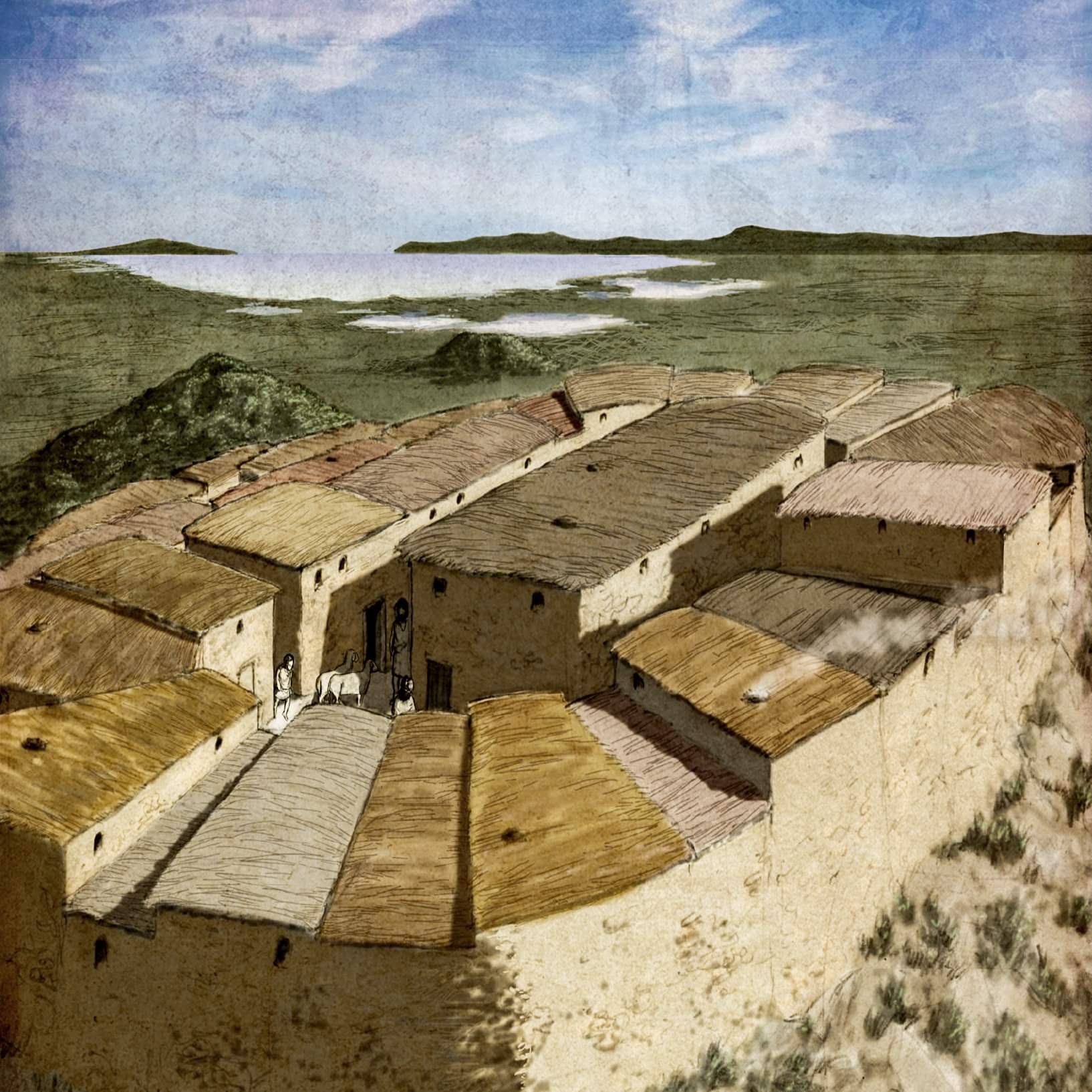 1930 Cabezo Pardojueves, 21 de septiembre de 2023  Gran ilustración de Juan Antonio López Padilla (le he retocado fondo, contraste, etc.) que recrea el yacimiento #argárico de Cabezo Pardo, en San Isidro, Alicante, Vega Baja del río Segura. 0,3 hectáreas de extensión, de 30 a 90 habitantes, ubicado en altura, varias fases de construcción/incendio/reconstrucción entre el 1.950 y el 1.500 a.C.