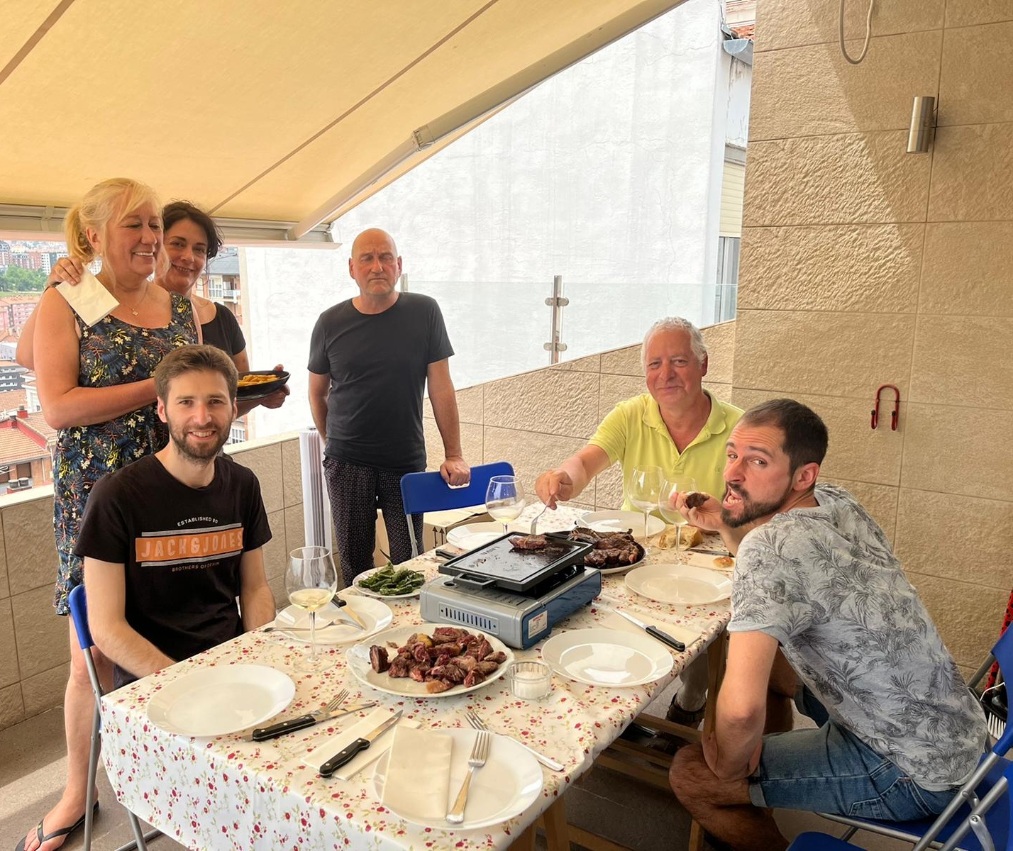 Pues ya estamos todos. Antes de comenzar con la carne, nos sentamos todos alrededor de la mesa redonda y damos cuenta de los espárragos y los pinchos de huevo y langostino; con gran éxito de público y crítica. Y seguidito a la terraza.