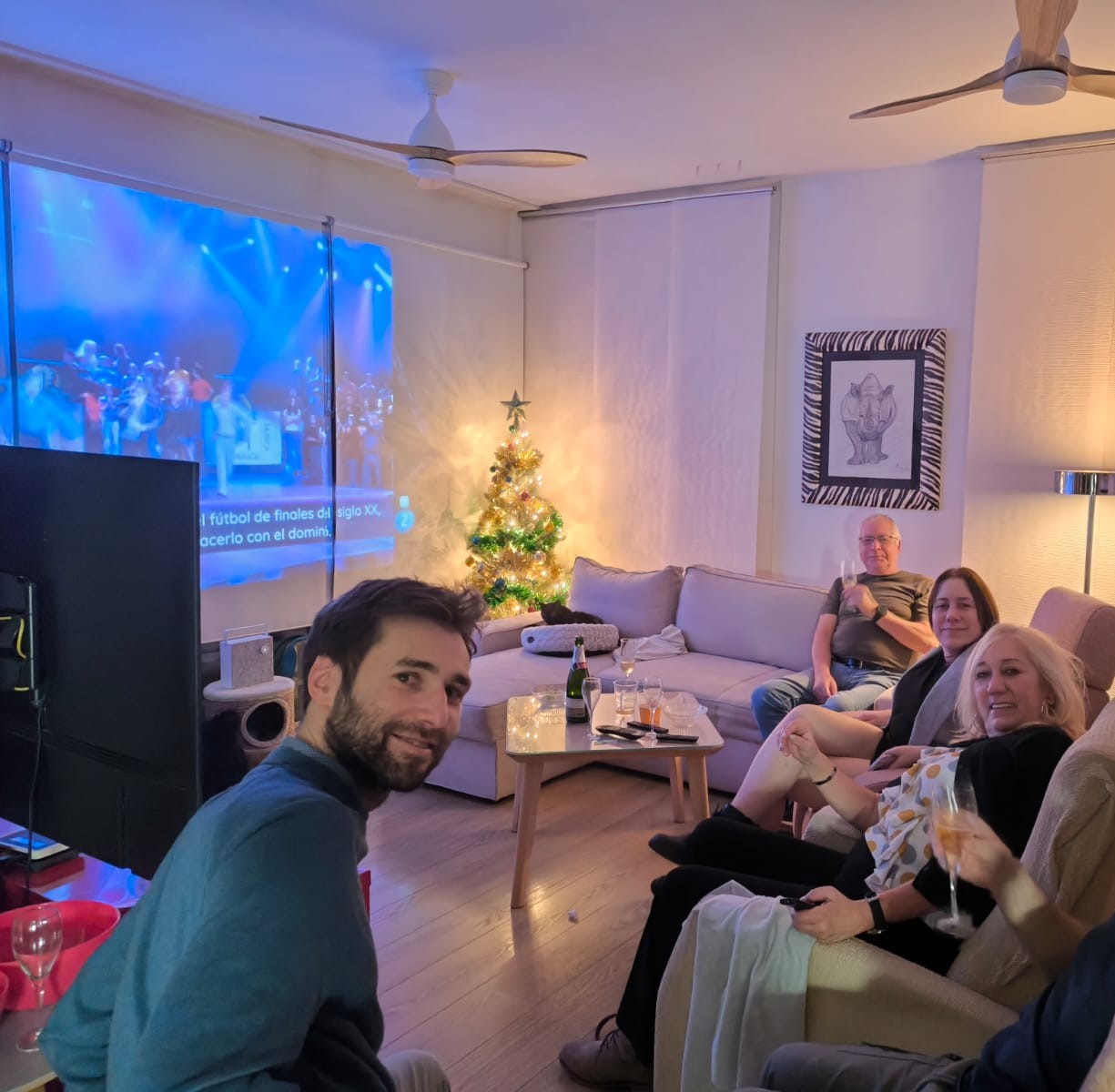 498 Nochevieja en pantalla grandemartes, 31 de diciembre de 2024  Este año la cena de Nochevieja se prepara y se consume en nuestra casa. Entre los asistentes no está tampoco este año mi chiquitín, pues no le convencen las opciones de transporte al término de la cena. En el menú que hemos desplegado sobre la mesa no falta una serie de clásicos familiares, como jamón, tortilla de patatas (mi especialidad), pastel de bonito (otra de mis especialidades), queso, paté, aceitunas y tal y cual. Y tras retirar los pocos restos de los entrantes damos paso a los platos calientes: croquetas y gambas plancha. Y ya, y de sobra. Todo ello regado con vinos blancos de Navarra y cava. Una vez concluida la cena... damos comienzo al espectáculo, un espectáculo... cinematográfico: sorprendemos al personal desplegando la pantalla grande y proyectando sobre ella la luz del proyector, sobre la que cabalgaban las cadenas generalistas con sus previos a las doce campanadas. Me encargo de preparar las doce uvas a los que desean comerlas (todos excepto Jorge y Esther, los raritos) y finalmente asistimos al evento de fin de año e inicio del nuevo de la mano de un popurrí de presentadores. Todo muy bien. El resto de la noche, hasta eso de las tres, estuvimos viendo cachitos musicales y haciendo risas; y dándole al cava hasta acabar las existencias.