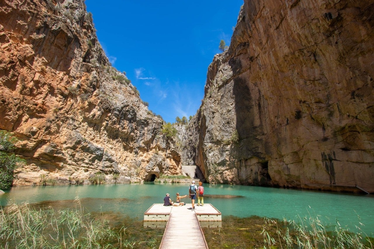 El destino por excelencia de Chulilla y que todo lo ensombrece es la llamada Ruta de los Pantaneros o la Ruta de los Puentes Colgantes, aunque quizá sería más adecuado referirnos a ella como la Ruta de los Calderones, que es así como se llama el paraje por el que discurre este popular sendero. Hablamos de las hoces que forma el Turia entre la presa de Loriguilla y Chulilla, un tramo donde la mano del hombre apenas ha podido intervenir, que se conserva relativamente virgen salvo por algún azud y un par de pasarelas suspendidas, y en el que está permitido el baño. La ruta, interpretada y señalizada, transita primero por la cornisa del acantilado, entre bosque de matorral mediterráneo, ofreciendo panorámicas impagables, para luego zambullirse en el barranco y entrar en un universo completamente nuevo, donde... leer más | #meta - #senderismo - #valencia - #paravisitar