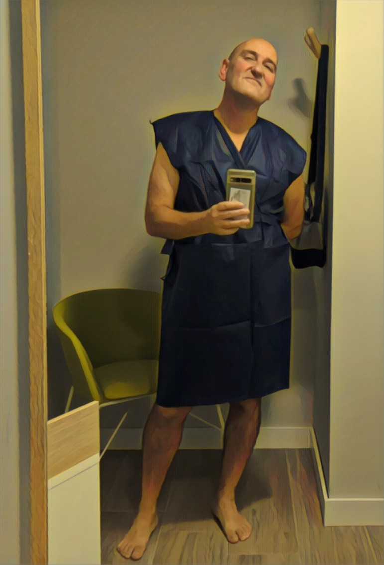 El caso es que poco antes de las nueve se escucha mi nombre en voz femenina. Me acompaña la muchacha en bata blanca hasta un "probador" (tenía su espejo, su silla y su perchero; y un mueblecito con una pila de prendas de un azul intenso que resultaron ser batas de papel). «Desnúdate, te dejas sólo el calzoncillo y los calcetines y te pones "la bata"», me suelta así, mecánicamente, sin rastro de emoción en su voz; mucho mejor un poco de frialdad en un momento tan "así".