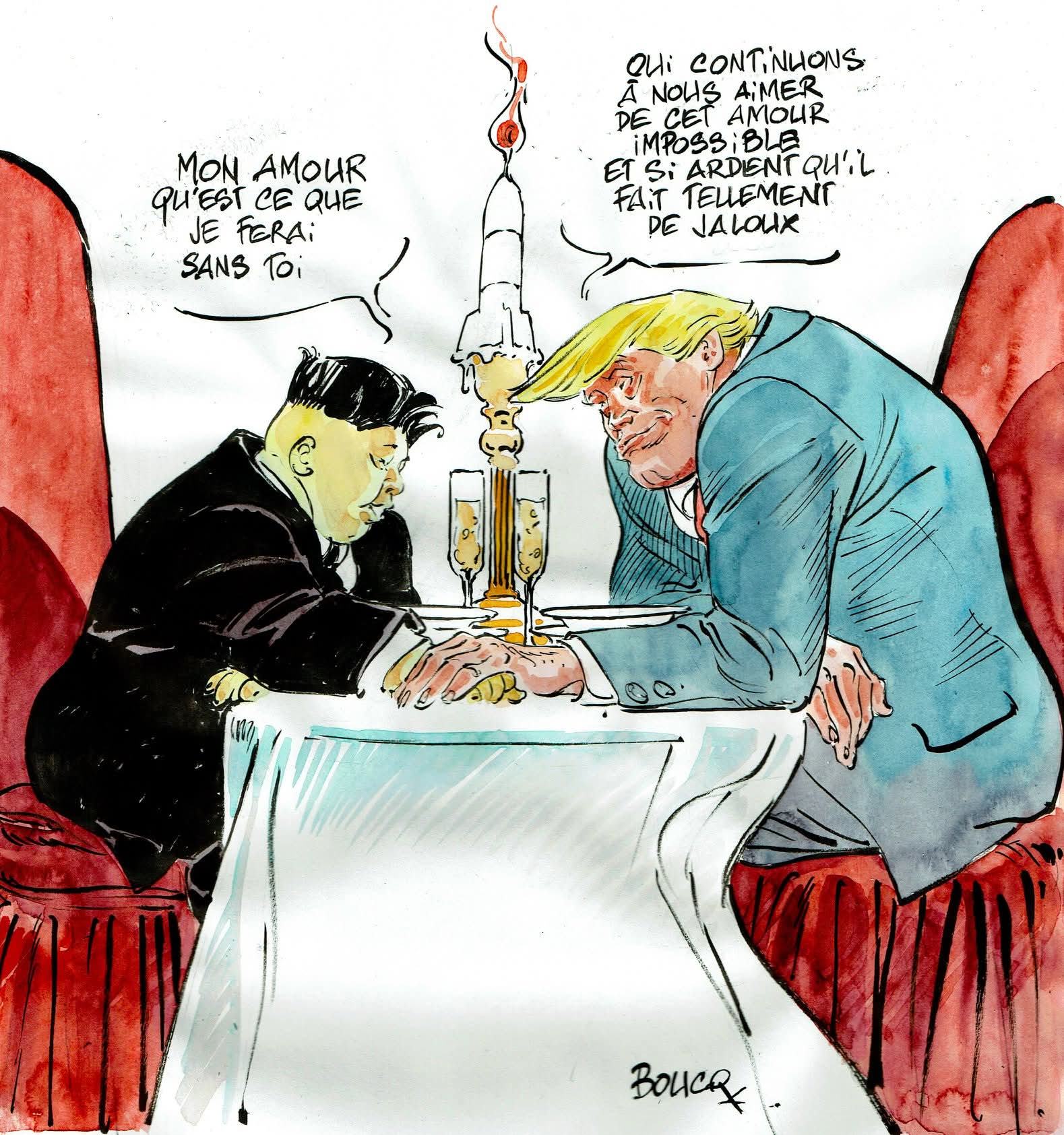 701 Trump y Kim Jong-Unviernes, 14 de febrero de 2025  Un viernes memorable, por lo ful. Una salida rápida al BM a comprar elementales de última hora para la comida familiar del sábado; cebollas, puerros y coles de Bruselas; picoteo embutido para nosotros e Indi. Donde mi China compro escoba y recogedor nuevos, para mandar a tomar por culo a la vieja escoba potrosa de la terraza. De regreso en casa me visto con ropa de faena y me afano, dándolo todo, en la limpieza de la terraza, a base de lejía en spray y mucho frote y mucho dolor de hernia. He preparado salsa de tomate que me requiere Raquel para la sopa y que será el ingrediente principal de la comida del día: espirales de lentejas con coles y tomate -menú que finalmente se cumplió pero no se disfrutó por mor de la borrachera que aconteció durante las horas del mediodía y posteriores, y de la que prefiero no hablar-. Hemos pasado la tarde noche en plan in crescendo, hasta tocar el techo y cruzar la frontera de los modales y las buenas costumbres. Tanta canción que nos recuerda otros tiempos siempre produce empacho y mal humor, y las cosas terminan como el rosario de la aurora; en fin. Durante el duermevela todo se fue aletargando y las lágrimas volvieron a su nicho de vida. Una vez más y, aun no deseándolo, no será la última. | #trump - #KimJongUn - #sopadepescado - #fieston