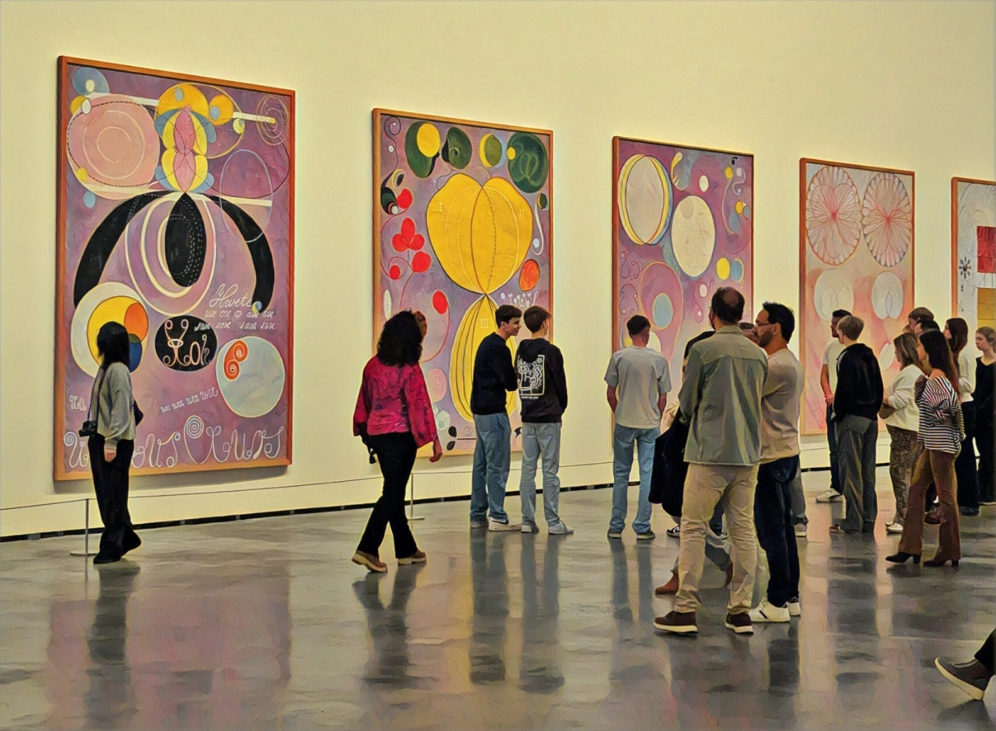 915 Domingo de Guggenheim.jpg) Una visita más bien fugaz, pero atrayente e intrigante; la mente sugiere «he de volver en una ocasión más solitaria, para degustar todo esto sin prisas y a mi puto aire». A Raquel también le ha gustado, y ha confesado pensar lo mismo; bien. Hacemos entrada por abajo, dejamos sudaderas en el guardarropa, visitamos la planta 2ª que es donde están expuestas las obras de Hilma af Klint... Al cabo de media hora salimos también por abajo, para regresar al barrio por la orilla de la ría. | #guggenheim - #raquel