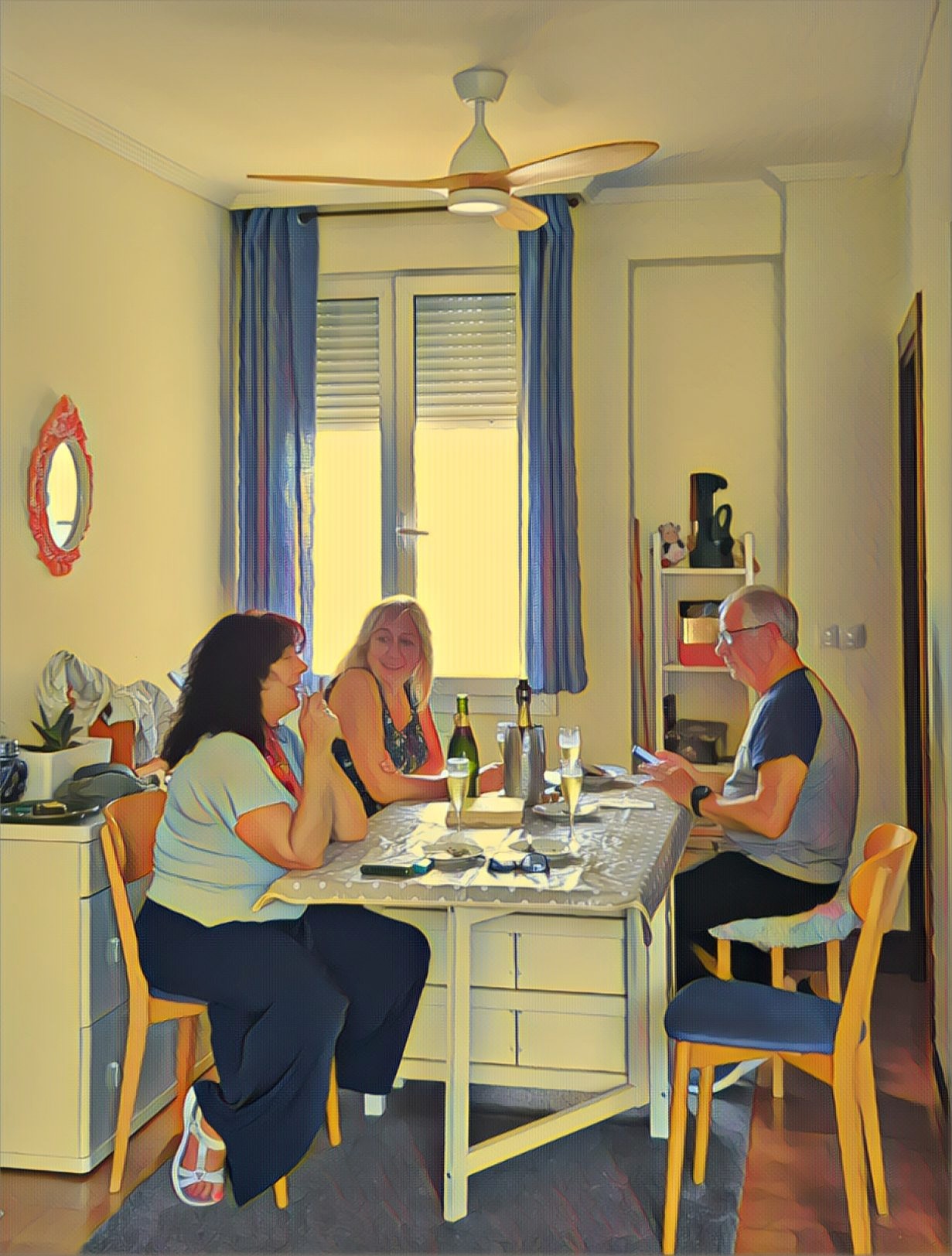 521 Comida cumple Jorge en Primdomingo, 22 de septiembre de 2024  Se celebra el 67 cumpleaños de Jorge en su casa de Prim; acuden los de mayor edad, ya que la juventud está de vacaciones en Perpiñán. Antes de acudir a la comida nos hemos dedicado a poner la casa en orden y a colocar detalles decorativos pendientes; como por ejemplo el nuevo toallero aro, el pensado para soportar la toalla de manos, y que ha quedado, por cierto, genial, o más. Es la una cuando salimos a la calle. Hacemos tiempo echando un pinchito (sandwich de anchoas rebozadas) en el Cynos, que acaba de remodelar el local dándole un aire renovado y actualizado. Y a Prim. La Tata no innova ná de ná: lata de anchoas BM, gambones plancha (medio así, muy sucios, ya sabes) y solomillo a la piedra (otra manía de Esther, eso de cortar el solomillo como si fuera carne para guisar, algo difícil de apoyar). Blanco Albariño y cava Juvé & Camps. Nos vamos bien pronto; apetece estar en casita, en plan dominguito rico. Me veo el partido del Athletic contra el Celta (3-1) y me fumo un par de petas, o tres, no recuerdo.