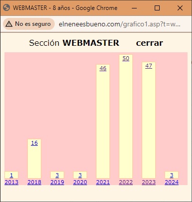 1659 Retorno a los gráficos en aspmartes, 09 de enero de 2024  He mascado código y neuronas para montar un archivo de gráficos de barras, en la línea de lo que hice en su momento en la web del CSD. No ha sido tan difícil, simplemente ha requerido un plus de concentración y otro plus de paciencia; y conseguido. El archivo se llama grafico1.asp y en principio está enlazado desde secciones.asp, pero sería fácilmente exportable desde otros enlaces que trabajen con fechas; ahí lo dejo. | #graficos