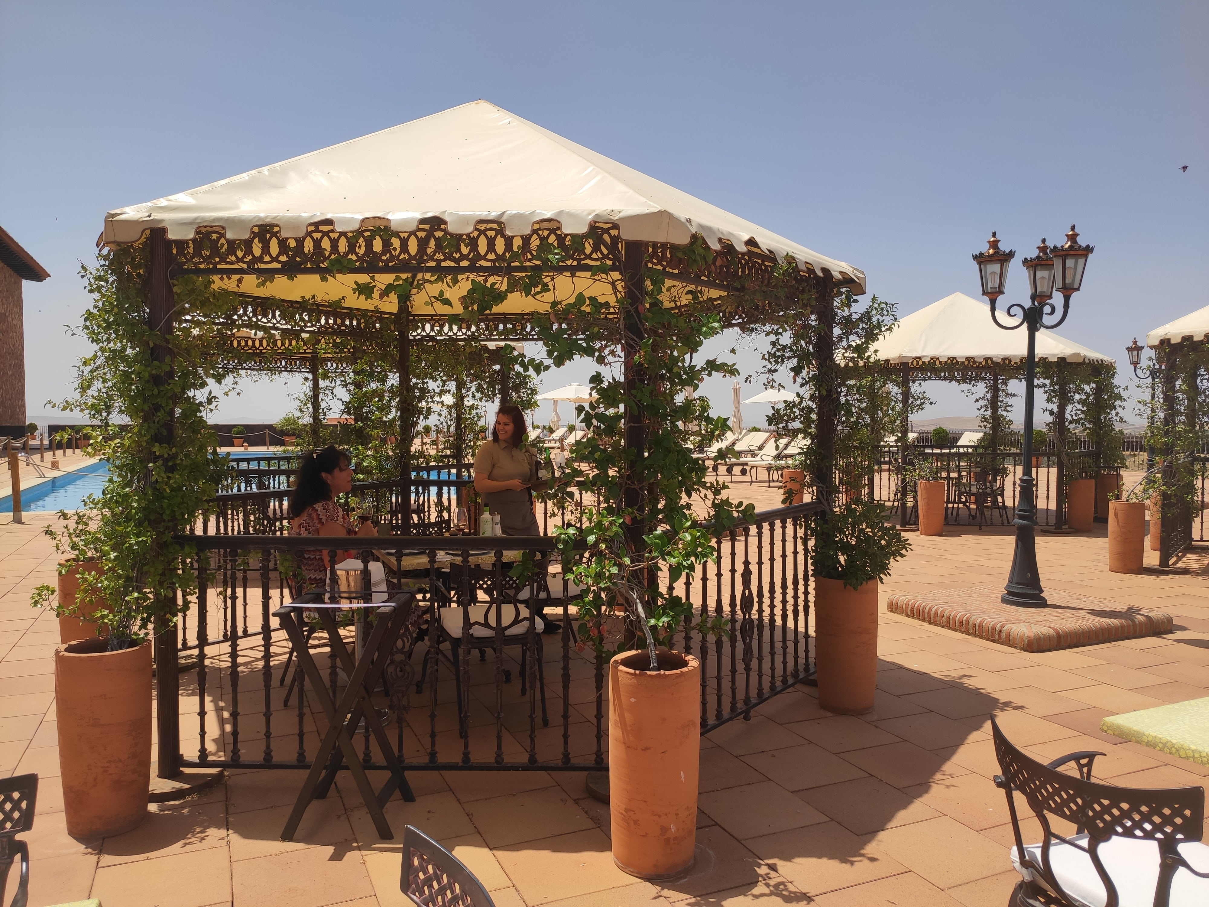 2787 Órgiva 15 - Adiós y Hola Hotel 5 *****sábado, 02 de julio de 2022  Salida de Los Cortijuelos. Tempraneamos lo suficiente como para tener todo preparado y empacado a eso de las nueve. Antes de emprender la ruta paramos en la gasolinera de Manolo a darle una limpiada al coche, para llegar con elegancia al hotelazo que nos espera. Para no faltar a las buenas costumbres hacemos parada técnica en Las Tinajas, en Guarromán. Unas tostadas sabrosas y untuosas y un rato de reposo. Y hacia Torrenueva, en donde está ubicado el hotel que ha elegido Raquel. Llegamos sobre la una y media. Del hotel... qué decir? pues que sobran las palabras, hay que visitarlo y disfrutarlo. Nuestro plan completo incluía comer en el restaurante Retama, que tiene una estrella Michelin, pero no tenían sitio; lástima. Nos tuvimos que conformar con comer en el restaurante del hotel, el restaurante EL Prado. Ah, no he mencionado la habitación, la 209, en la Torre Norte. Una maravilla. Con su cama king-size, con su cuarto de baño a todo tren, con su ducha de chorros y su bañera de dos plazas estratosféricas. Con su balconada en la que revoloteaban las golondrinas por decenas. Con su tele enorme. Y la decoración exquisita. Una maravilla. Pues nada. Comimos en la explanada de la piscina, en un cenador muy lindo, bañados por el sol manchego; calor y luz. Menú: aperitivos y aceitunas, ensaladilla de entrante y un arroz con sepia y langostinos. Una botella de tinto que eligió Raquel. Una comida inolvidable. Y después de la comida un pase por la habitación para disfrazarnos de bañistas de luxe, y al SPA a gozarlo durante una horita. Y del SPA a la piscina, y las tumbonas y el sol. Y al atardecer cotilleamos como tanto nos gusta: se celebraba un bodorrio de los de alto copete. Elegancia y antielegancia; pero todo muy divertido. Y la cena? Club Sándwich La Caminera. Muy excesivo. Pechuga albardada, huevo frito, bacon, queso, tomate y lechuga. Excesivo. Y por la noche? reflujo, ardores, malestar estomacal. En fin. | #202206orgiva - #guarroman - #lastinajas - #hotel - #lacaminera
