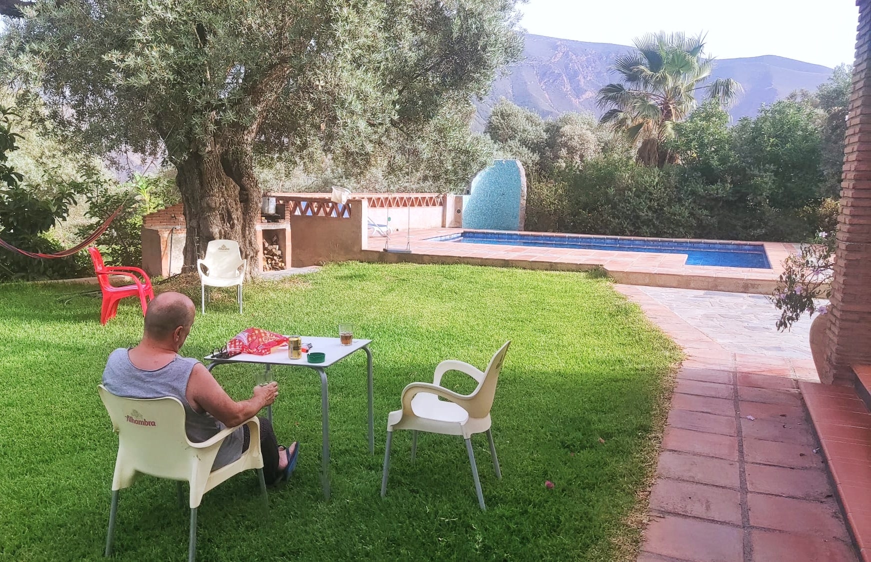 582 Órgiva 01 - Por la ruta de los íberossábado, 18 de junio de 2022  Sábado, toca preparar el equipaje para emprender cambio de morada de vacaciones: pasando de Benicassim a Los Cortijuelos en Órgiva. El día se anuncia en los medios como muy tremendo, acalorado y asfixiante; así que la idea es madrugar, hacer las maletas, cargar el coche y salir pitando, antes de que el sol ponga el asfalto de las carreteras a punto de caramelo pegajoso. Es lo que hacemos. A las 8:40 arrancamos el Lodgy y emprendemos viaje. La ruta nos lleva por las afueras de Valencia, por las afueras de Murcia, por las de Lorca y por la Hoya de Baza, para finalmente tomar la circunvalación nueva de Granada, la A-44, y hacer el recorrido clásico hasta llegar a Órgiva. Hacemos una parada para comer en un bar de carretera ubicado entre Baza y Guadix. Nos atiende una muchacha muy dispuesta y eficaz. Nos comemos un salmorejo que más parecía un gazpacho, muy rico, y un secreto a la brasa cojonudo. Y por 10 euros el menú, ya te digo. Llegamos a los Cortijuelos a eso de las cuatro y media. Saludamos a Paqui, que estaba en casa vigilando la siesta de César; José Antonio estaba limpiando la acequia. Y aterrizamos en Los Cortijuelos con unas ganas tremendas de descansar y disfrutar, por fin, de las vacaciones. Y nada, tras vaciar el coche y organizar lo mínimo los trastos, nos damos nuestro primer chapuzón de la temporada orgiveña: el agua deliciosa y el silencio y la paz... memorables. Un día intenso, vivido sin contratiempos ni inconvenientes. Mi deseo es que el resto de días en La Alpujarra transcurran en calma y moderada fiesta; lo de moderada creo que va a ser difícil, jajaja. | #202206benicassim - #202206orgiva