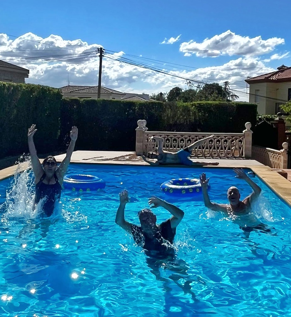 79 Día 25 - Con el famulio en Oturamiércoles, 19 de junio de 2024  Hay emoción en el aire, vamos a Otura a pasar el día con Txetxu, Rebeca y Jorge. Antes de emprender viaje hago paradita en la gasolinera de Manolo para repostar AdBlue (4,45 litros por 4,23€). De camino a Otura hacemos parada en La Venta del Chaleco a comprar cositas ricas de comer y beber. El sitio está muy bien, hay mucha variedad de todo: quesos, aceites, mermeladas, embutidos , vinos, etcétera. Compramos bastantes cosas; quesos, mermeladas, un licor de vino tinto para Jorge, suero de leche para mí, y algo más que seguro que olvido. Hemos quedado con Rebe y su padre en Otura, en el bar gallego, el Camino de Santiago; se supone que es una sorpresa para Jorge, ya que le ha dicho Rebe que vana Correos a recoger un paquete, blablablá, jajaja. Cuando llegamos aún están poniendo las mesas en el gallego, por lo que nos instalamos en un bar que está justo al lado a echar una primera caña. Y, bueno, llegan a la hora prevista la Rebe y Jorge, hay una especie de sorpresa y, ahora sí, nos vamos al gallego a tomar unas cañas. Un rato nada largo y tiramos para el cortijo. Txetxu está todo atareado preparando el horno de leña en el que va a cocinar un costillar a su estilo, como el del año pasado supongo. Obviamente hacemos efectivo el regalo "jamonero" a Rebe y Jorge se pone manos a la obra para cortar las primeras lonchas y tal. Y piscineo divertido. Picoteo en el cenador de la piscina, a base de jildas, cortezas, jamón, y cervezas... Nosotros aportamos inflables de piscina y pasamos un rato largo jugando a una especie de voleibol muy guapamente. Sobre las tres y pico nos sentamos a comer las costillas; buenísimas, Txetxu tiene madera de chef. Y en ese plan distendido hasta eso de las siete y media que iniciamos regreso a casa. Un día muy muy bonito con el famulio (que no esté Esther ayuda a que todo sea fluido y amable, hay que decirlo...) | #2024orgiva - #ventaelchaleco - #otura - #famulio - #jamon