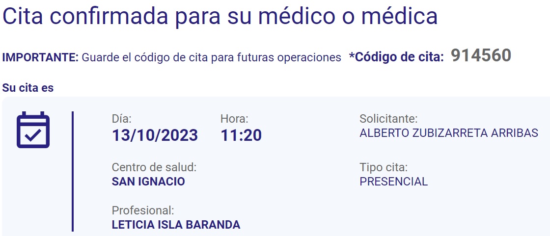 1888 Cita con Leticiaviernes, 13 de octubre de 2023  Para asunto OJO IZQUIERDO Para asunto ADUCTOR DERECHO Me ha atendido Libe, una médico residente. Todo bien, lo de la ingle queda pendiente de ver evolución y en caso de no mejora se planteará hacer radiografía. Por lo del ojo nada que añadir, todo bien. | #medico - #leticia - #osakidetza