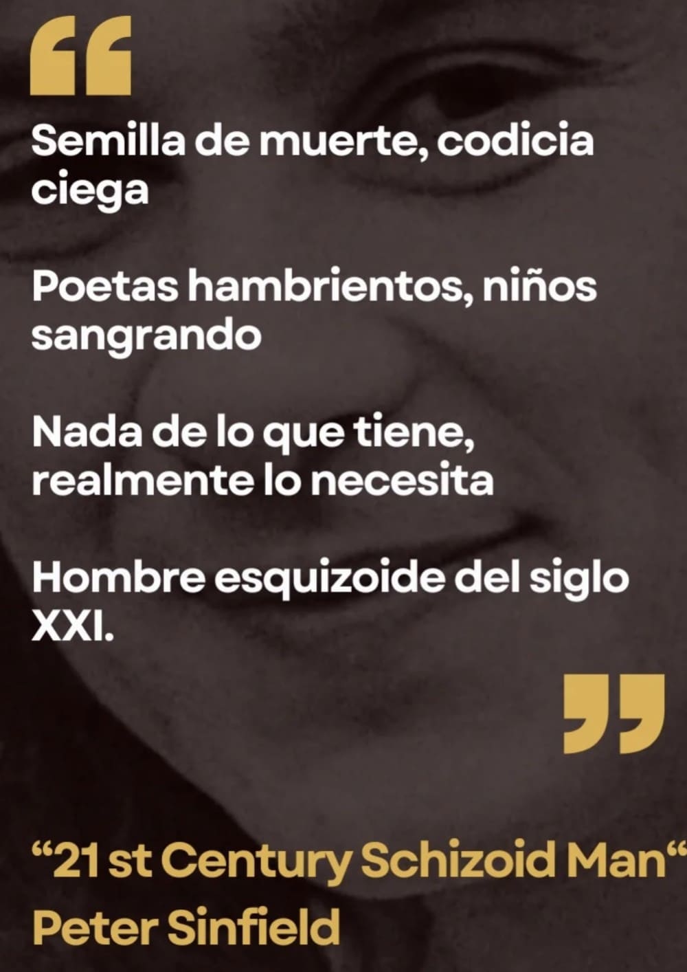Pata de gato, garra de hierro Los neurocirujanos claman por más En la puerta del veneno de la paranoia El hombre esquizoide del siglo XXI Bastidor de sangre, alambre de púas Pira funeraria de un político Inocentes violadas con fuego de napalm El hombre esquizoide del siglo XXI Semilla de muerte, avaricia del ciego Los poetas mueren de hambre, los niños sangran. No tiene nada que realmente necesite El hombre esquizoide del siglo XXI