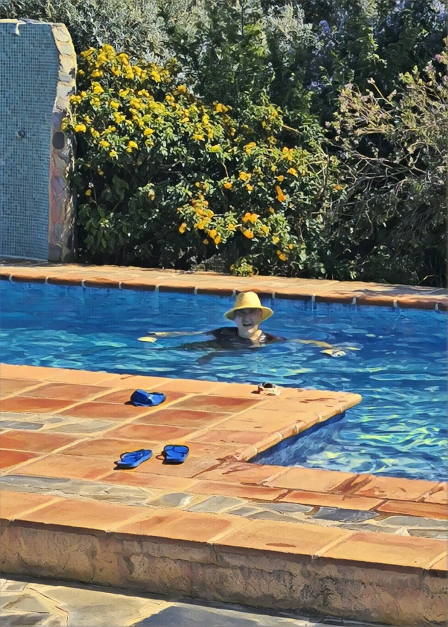 422 D06- Solomillo con verduras al horno y un sol de justiciamiércoles, 28 de mayo de 2025  Raquel aprovecha un rato de silencio en el subsistema de multiconferencias para darse el gusto de ir al pueblo caminando, con destino en la tienda de verduras, la que nos mola. Ha sido quedarme solito y respirar hondo: voy a encender el altavoz grande y poner musiquita guapa para que me acompañe mientras me hago mi ratito de largos a braza en la piscina. Ayer, en el último baño del día, antes de salir a golfear, me forcé a llegar a los 30 largos de piscina, con la intención de ir aumentando la cifra a medida que vayan transcurriendo los días; esta mañana he hecho 32 y, aunque me ha costado más o menos como ayer, lo he logrado sin sentir que me hallara al borde de una muerte súbita; sin más. A continuación he pasado a otra cosa más prosaica: me he afeitado una barba que había irrumpido desde el día de salida de Bilbao, desde el viernes, y que ya me mostraba en el espejo a un madurito acercándose a la tercera división. Justo reaparece Raquel cuando estoy poniendo orden en la cocina, ya vestido de alpujarreño, esperando para subir al coche y salir pitando a comprar movidas en el Consum; he reestrenado mi macutito de lona color verde militar, ése que lleva conmigo ni sé. Compras en el Consum: solomillo cerdo, jamón asado, butifarra catalana, verduras (tomatitos, patatitas, peras), 6 de agua con gas, barra de helado y barquillos, 4 yogures de cabra, 2 latas de anchoas, bolsa de 3 panecillos de centeno. Y sin más historias regreso al cortijo. Justo estamos ordenando la compra, metiendo mano al paquete de embutidos y probando el pan, cuando una voz proveniente de fuera nos hace dar un respingo: es José Antonio que viene a charlar. Le he entrado yo primero para comentarle lo de mover los tiempos de arranque del sistema de autolimpieza de la piscina, por aquello de que tiene un arranque a las 7:45 que justo coincide con el período de clase con Maite, y nos hace hablar a voces; me dice que lo ajuste yo, le digo que vale, pero que lo mismo la lío; veremos. Termina... leer más | #2025orgiva - #consum - #comedero - #lanjaron - #ventadelchaleco