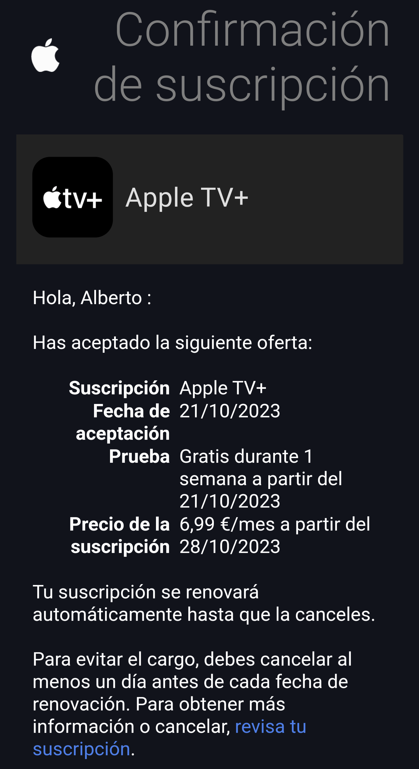 1853 Nos suscribimos a Apple TVdomingo, 22 de octubre de 2023  Son 6,99€ al mes. Lo cargo a la cuenta común, obviamente.