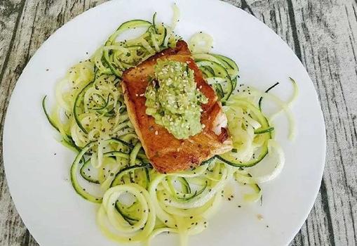 Preparación: Para hacer el guacamole machacamos un aguacate junto al tomate y la cebolla picados. Añadimos lima, sal y chile al gusto. Asamos los filetes de salmón con una cucharada de aceite. Podéis añadirle especias, salsa de soja, sésamo o lo que queráis. Mientras tanto, espiralizamos el calabacín. Se puede dejar crudo, o hacer al vapor durante un minuto en el microondas. Montamos el plato con los zoodles en la base, el salmón entero o desmigado y una cucharada de guacamole encima.