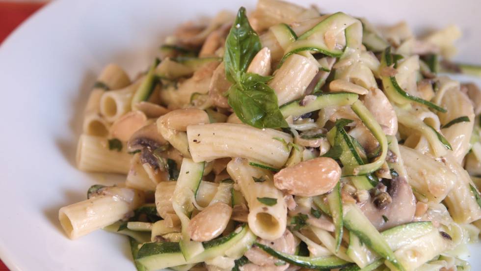 Mezclar el zumo de limón con la mostaza y salpimentar. Mientras se bate, añadir la nata y el aceite de oliva hasta que se forme una vinagreta emulsionada. Cortar en tiras finas los calabacines y los champiñones en láminas. Mezclarlos con el calabacín, la pasta cocida, la albahaca, las almendras picadas y la salsa. Terminar con unas hojitas de albahaca y almendras enteras para decorar.