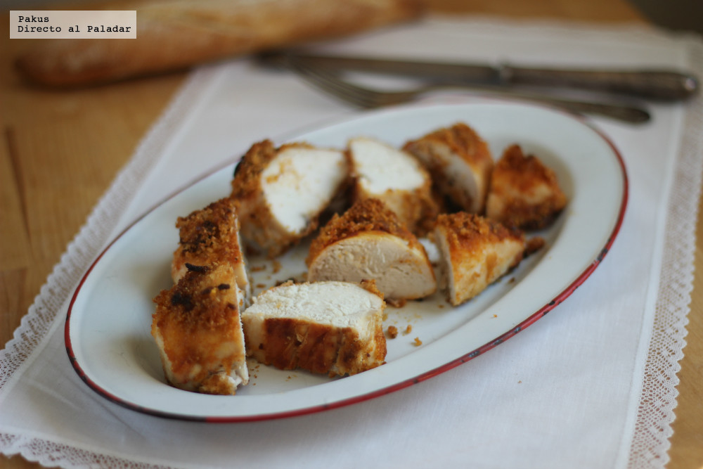 Después, cubrimos las pechugas con la mezcla de pan, queso y especias y apretamos un poco con las manos para que se pegue bien. Metemos las pechugas en el horno cuando estén ya listas para hornear y dejamos que se cocinen hasta dorar la cobertura de pan. Normalmente ... leer más | #pollo