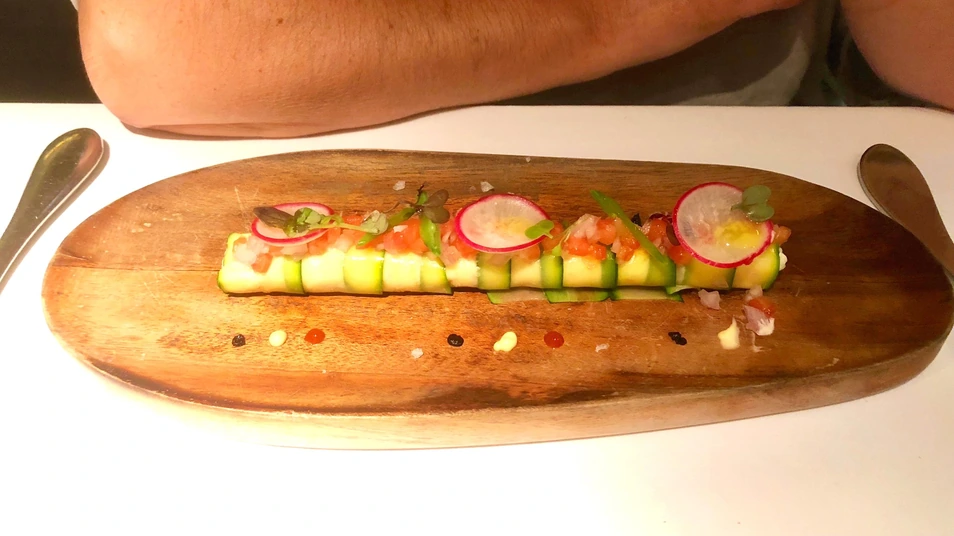 139 Carpaccio de pepino con sardinas y queso de cabradomingo, 26 de diciembre de 2021  Hemos puesto sobre una base de pepino cortado muuuy fino con ayuda de una mandolina de cocina.