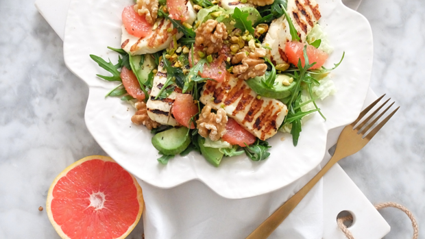 - En un bol mezclar la lechuga limpia en trozos, la rúcula, el pomelo en gajos, el queso a la plancha, el aguacate pelado en trozos, la vinagreta y los frutos secos en trozos. ¡A servir y disfrutar!